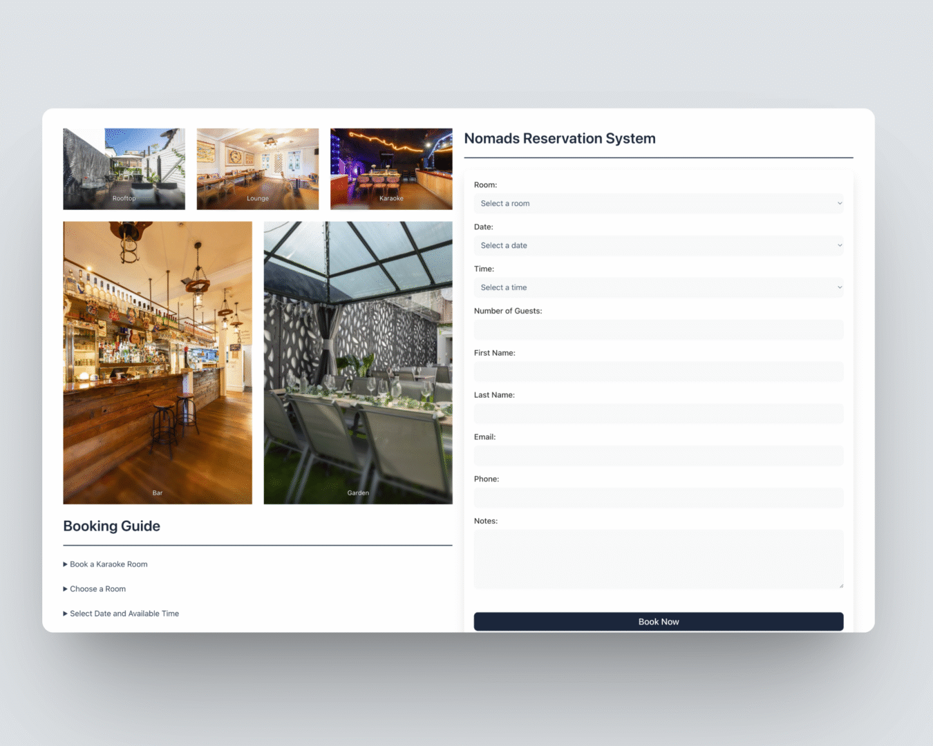 A bespoke WordPress-based reservation system built specifically for Nomads, allowing customers to easily book tables for casual meals or group events — fully manageable from the admin panel. - Private Event & Function Inquiries
