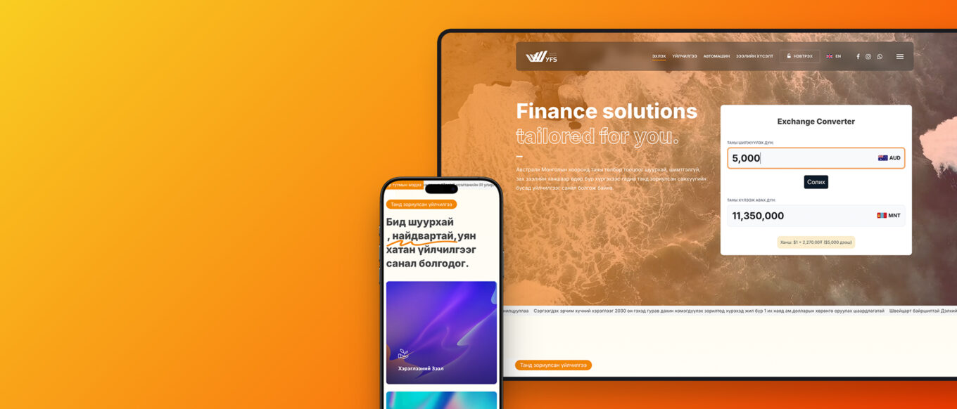 The website clearly presents the company’s core offerings — including consumer and vehicle loans, AUD – MNT exchange, and cross-border remittance — in both English and Mongolian, with mobile-friendly layouts and bilingual content support.