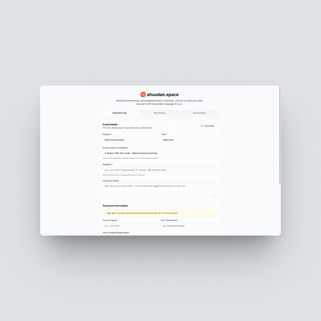 Built with a user-first mindset, Shuudan.space empowers users to write faster, sound more professional, and communicate confidently — across any language or tone.
